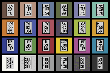 http://www.babelcolor.com/download/ColorChecker_RGB_and_spectra.xlsBabelColorというところが計測した平均値が使われている。時期的にはこちらのほうが新しい。